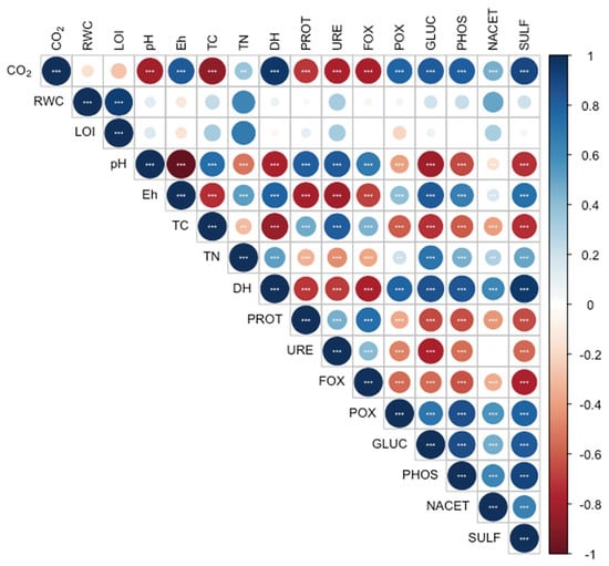 Spearman correlation coefficients: (ρ) correlograms, between the sediment Extracellular Enzymatic Activities (EEAs) (DH, dehydrogenase; POX, peroxidase; FOX, phenol oxidase; PHO, acid phosphatase; GLU, b-glucosidase; NACET, N-acetylglucosaminidase; SULF, sulfatase; PROT, protease; URE, urease) and physic-chemical traits (RWC, relative water content; pH; redox potential, Eh; LOI, organic matter content; TC, total carbon content; TN, total nitrogen content) of the rhizosediments exposed to 410 and 700 ppm atmospheric CO2. Significant correlation coefficients are represented by asterisks (** p < 0.01, *** p < 0.001).