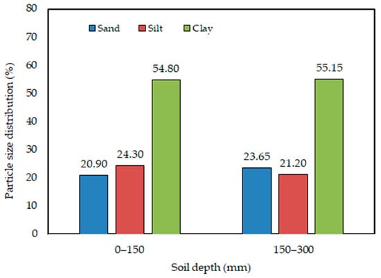 The infiltration experiments were located at the Rice Mechanization Center’s Research Farm in Meet El Deeba, Kafr El-Sheikh, Egypt (longitude: 30°51′17.6″ E and latitude: 31°06′59.3″ N), and the soil water infiltration trials were carried out in a clay field. Four soil samples were collected from a nearby location and used to analyze the characteristics of the soil. The average percentage sand, silt, and clay contents at the experimental site for two soil depths can be seen in Figure 1. The soil bulk density was observed at two soil depths (0–150 mm and 150–300 mm), with values of 1.12 and 1.21 g/cm3, respectively. The experiments were conducted on an area of 0.405 ha. Water was applied to the test area, and it was then permitted to dry out until the soil moisture content was between 15% and 19% db.