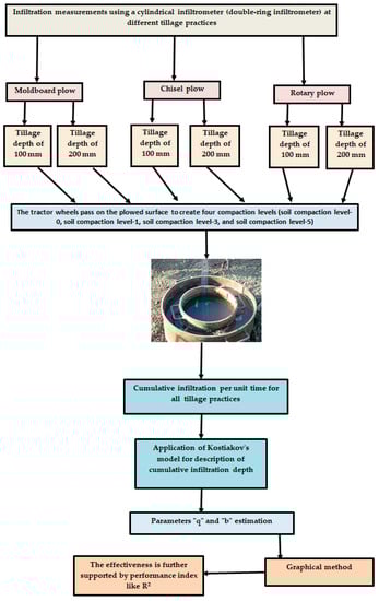 The infiltration process, which is crucial for designing irrigation and drainage systems, evaluating groundwater recharge and contamination, managing floods and droughts, etc., is frequently influenced by a number of variables, with soil use, soil cover, and soil physical characteristics being the main ones [1]. Hydrologists and water managers face a major challenge because of the considerable spatial variability that these factors cause in the infiltration process. Therefore, the soil infiltration water characteristics under various tillage practices for soil preparation for crop output must be defined. These characteristics are crucial for the construction of irrigation systems [2]. Due to the impact of soil use variation on the spatial changeability of infiltration parameters, numerous trials and theoretical investigations have been performed that aim to understand the links between infiltration processes and various agricultural management practices, in particular tillage operations [3] as they alter soil structure by creating macrospores that significantly affect the water infiltration rate into soil [4,5,6,7].