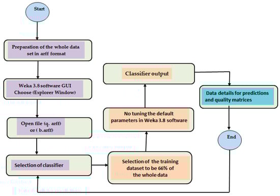 Flowchart for modeling of “q” and “b” in Equation (2) using Weka software.