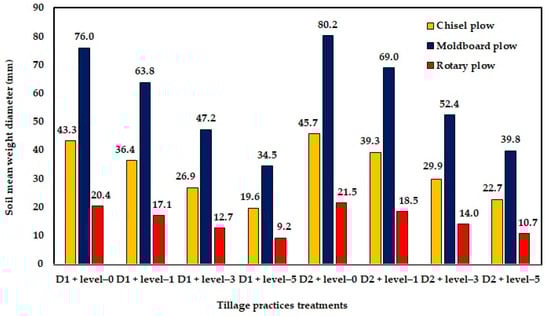 Variation in average soil MWD under investigated tillage practices treatments for rotary, chisel, and moldboard plows (D1 represents a tillage depth of 100 mm and D2 represents a tillage depth of 200 mm).