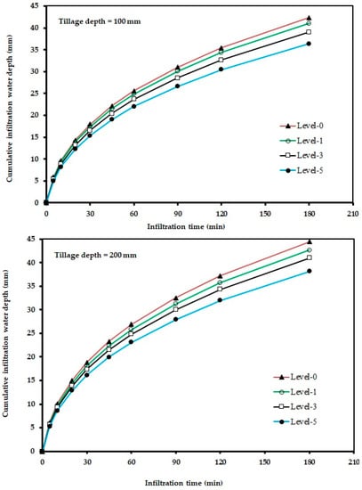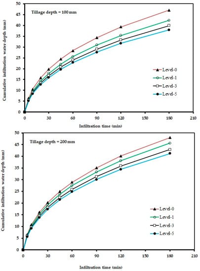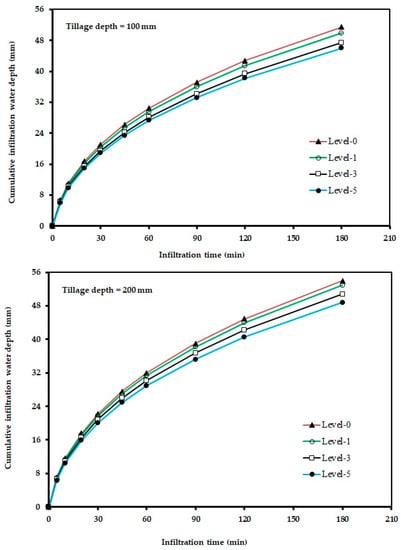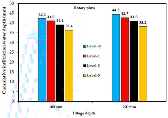 Field measurements of cumulative infiltration depths for rotary plow tillage with two tillage depths and under different soil compaction levels.