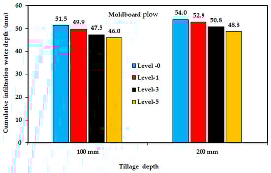 The observed cumulative infiltration depths versus time for the moldboard, chisel and rotary plows are presented in Figure 5, Figure 6 and Figure 7, respectively, under tillage practices with two tillage depths and under different soil compaction levels. Observing Figure 5, Figure 6 and Figure 7, it is clear that the cumulative infiltration generally increases with increasing infiltration time, and it can be expressed as a power function. Figure 8, Figure 9 and Figure 10 present the impact of tillage depth on final cumulative infiltration after 180 min at altered levels of wheel traffic for moldboard, chisel, and rotary plows as average values, respectively. It is noticeable that the water cumulative infiltration depth varied between 46.0 and 54.0 mm after 180 min for the moldboard plow. It varied between 37.9 and 48.0 mm after 180 min for the chisel plow, while for the rotary plow, the cumulative infiltration depth varied between 36.4 and 44.5 mm after 180 min. Water infiltration into the soil is claimed to be directly affected by soil tillage methods [70], and the moldboard plow plot in this research had the ability to take in water at a faster rate than the chisel and rotary plowed plots. This could also be due to the porous nature of the moldboard plow plots and because the soil is coarser than in plots plowed by other tillage implements. The MWD in the moldboard plow plot ranged from 34.5 mm to 80.2 mm; for the chisel plow it ranged from 19.6 mm to 45.7 mm; and for the rotary plow, it ranged from 9.2 mm to 21.5 mm. Generally, primary tillage tends to yield a rough surface finish [71,72]. Plowing processes conducted at different tilling depths and wheel-traffic compaction alter the pore structure of the clay soil [73], and these modifications affect solutes, water movement, and root growth. In a study conducted by Al-Ghazal [74], it was discovered that the chisel plow, followed by the moldboard plow and the rotavator, had the highest mean infiltration rate of soil at the highest rate of compaction (5 passes of the tractor). The additional soil disturbance caused by the chisel plow as compared to moldboard and rotavator plows may be the cause of the higher soil infiltration rate.
