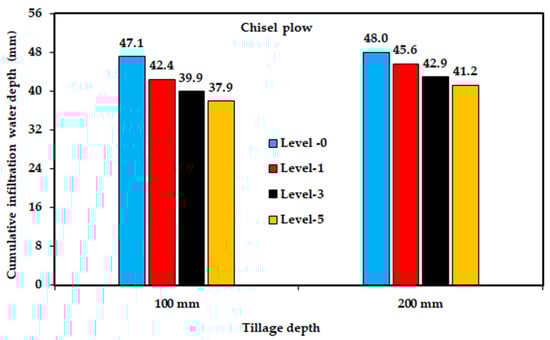 Field measurements of cumulative infiltration depths for chisel plow tillage with two tillage depths and under different soil compaction levels.