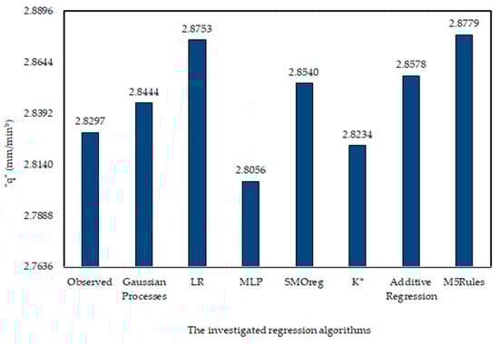 Figure 11 and Figure 12 provide bar graphs for the average values of the parameters of “q” and “b” using the investigated regression algorithms compared with actual values in the testing dataset. The average actual for “b” was 0.5576 dimensionless in the testing dataset (14 points) and the closed average for the KStar (K*) method was 0.5573 dimensionless. The average actual value for “q” was 2.8297 mm/minb in testing dataset (14 points), and the closed average for the K Star (K*) method was 2.8234 mm/minb.