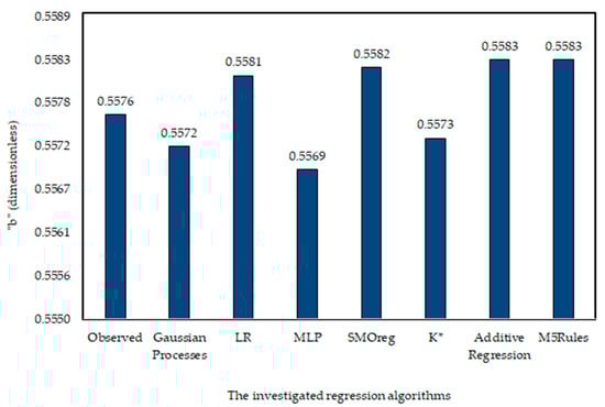 Bar graph for the average values of the parameter “b” using the investigated regression algorithms compared with observed values in testing dataset.