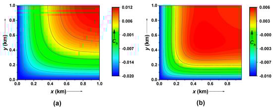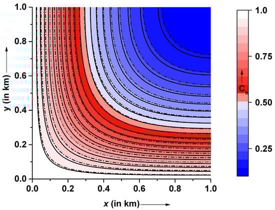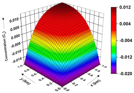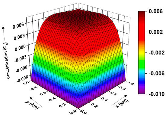 Figure 4 depicts the contour of the pollutant distribution pattern obtained using the CN and ADI methods under the assumption of linear sorption. For the present case, periodic initial and boundary conditions with a gravel-type soil medium for the time period are considered. As evident, the pollutant concentration is maximum along the coordinate axes and decreases with respect to distance towards the extreme boundaries. It may be noted in Figure 2, Figure 3 and Figure 4 that the concentration could be negative since the assumed sinusoidal initial and boundary conditions in this work are known to manifest fluctuations in the concentration and thus output a few negative values [].