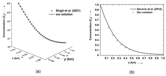 The proposed numerical solution was compared graphically with the previous existing numerical solution [] for 1D contaminant transport with spatially varying transport parameters. The proposed 2D ADE model in this work was reduced to a 1D ADE transport problem by setting all the -directional terms to zero and subsequently taking the input source as a single point source. The input data considered for comparison is as follows: , , , , , , , . We have used the above data in our model with previous numerical solutions. As observed, both solutions match closely, as shown in Figure 6b. Statistically, the relative match for the proposed solution with the numerical methods shown in Figure 6a,b is found to be 99.7% and 97.2%, respectively.