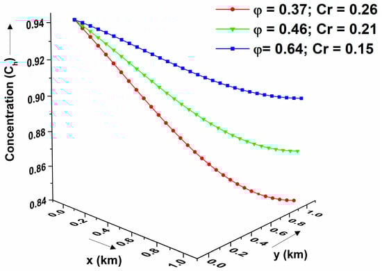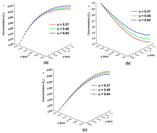 In general, the level of contaminant concentration is a factor of different geological formations in the 2D heterogeneous porous medium; hence, the pattern of pollutant concentration levels in geological formulations of different porosities is investigated in the present study. For this case, different soil mediums, such as clayey sand, fine sand, and silty, represented by porosity, are considered. Figure 7a shows the pollutant distribution profiles in various soil mediums at time years estimated using the CN method, assuming linear sorption for periodic initial and axial boundaries. The pollutant concentration is highest for silty sand compared to clayey sand and fine sand. In contrast, the pollutant concentration hits the minimum level in the clayey sand. The effect of different soil mediums on the concentration distribution is shown in Figure 7b for exponential axial input sources subject to a constant initial concentration value at a given time years. The contaminant level decreases with the decrease in the soil’s medium porosity. Figure 7c depicts the concentration distribution pattern for different soil mediums for asymptotically varying axial input sources with a constant initial concentration value under non-linear sorption for time year. It is observed that the contaminant concentration level in the silty medium is higher than in the fine sand. In contrast, the contaminant concentration reaches the lowest level in the clayey sand for asymptotically varying axial input sources. Also, concentration reaches its minimum value at the final boundary. Also, it is observed that the distribution of contaminant concentration patterns is similar in the sinusoidal and asymptotic cases but opposite in nature in the exponential case. Since the exponential input source typically represents a sorption-dominated flow process, a higher porosity (more pore space) causes more retardation of the contaminant particles, and hence a slower decay rate is observed.