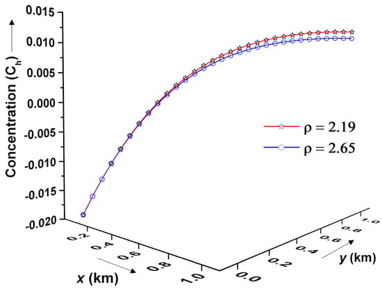 Figure 8 shows the pollutant transport profile at time years for different bulk densities of contaminant concentrations () in the gravel medium assumed to be in a solid matrix-type packing. To characterize the concentration profile in this case, periodic boundary conditions are considered. It is observed that the initial pollutant concentration for both bulk densities considered is similar near the inlet boundaries. However, as evident from Figure 8, contaminant concentration diminishes relatively fast for a higher bulk density () compared to a low bulk density ( ).