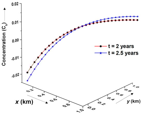 Figure 10 presents the concentration distribution profile at different times ( years) subject to periodic initial conditions in a heterogeneous groundwater flow system. Initial and boundary conditions are assumed to be periodic for both time domains. In general, it is observed that the concentration distribution decreases with increasing time domain up to some spatial distance. However, beyond a certain threshold distance, the concentration distribution increases with increasing time. It is observed that the concentration distribution profile depends on the nature of the initial and boundary conditions.