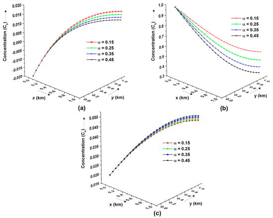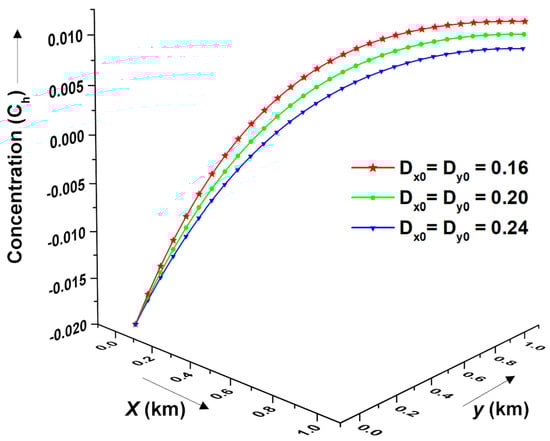 Figure 11 presents the effect of the dispersion coefficients in the longitudinal and transversal directions over the concentration distribution profiles. It is observed that even with a marginal fluctuation in the dispersion coefficients, the resultant concentration distribution profile varies significantly at each point of the domain. The possible reason for such behavior may be attributed to the critical balance of the advection-dispersion flow process, which is altered by the change in the dispersion coefficients. Overall, the concentration value increases as the dispersion coefficients decrease for any given fixed time domain.