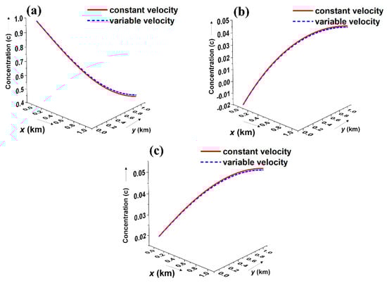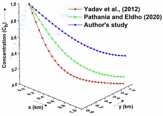 Figure 6(a) illustrates the graphical comparison of the numerical solution for the proposed model with the data (, , , , ,,, , , ,, ) taken from the previous literature given by []. To this effect, the proposed model is transformed into a homogeneous medium without source-sink terms by taking dispersion coefficients and velocities as constants. Also, the initial condition is taken as a constant, and the Dirichlet boundaries are taken as an exponential type. It is found that the pollutant concentration strength of the proposed model solution is identical and shows close agreement with that of [].