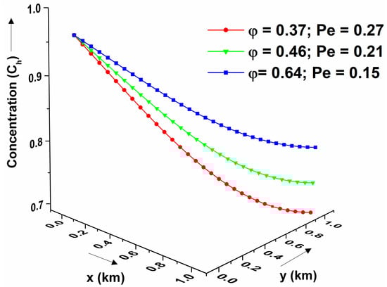 The relationship between the Peclet number and the porosity of the various geological formations is also addressed. As evident from Figure 15, the Peclet number increases as the porosity decreases, and vice versa. With a decrease in the Peclet number (increase in porosity), the overall contaminant concentration is found to be higher. The pollutant concentration decreases with space and approaches its lowest value near the extremes of the boundary. Similarly, in the case of the Courant number, the contaminant concentration is also predicted for the different geological formations.