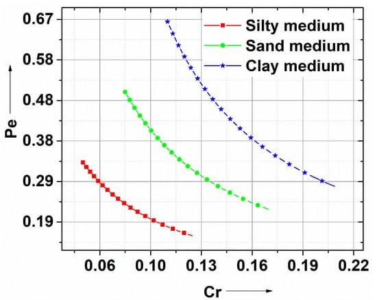 Figure 17 shows the contaminant transport dynamics using a plot between the Peclet and Courant numbers for various transport mediums with different inter-porosity ranges. As observed from Figure 17, the general trend within a given medium indicates a non-linear relationship between Pe and Cr with an increase in the inter-medium porosity. For advection-dispersion problems, the stability of the numerical solution can be inferred using the Peclet number. The solution will oscillate when the absolute value of the Peclet number is greater than two []. In the present problem, since the Peclet number is less than two, the proposed numerical solution is stable and hence not discussed in the manuscript.
