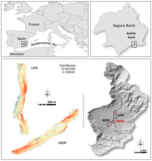Location of the study area (Azohía Rambla basin) in southeastern Spain and indication of the monitored channel reaches (upper and middle RCRs and their respective PBSAs).