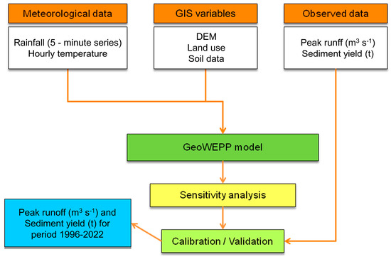 Flowchart displaying the steps in the event-scale GeoWEPP implementation process for the period 1996–2022. Process flow diagram applied to the sub-catchment of each RCR.