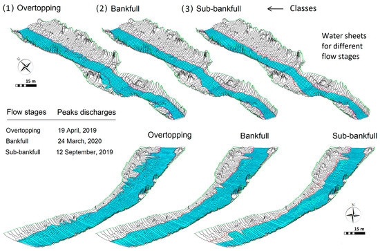 Water sheets for the flow stages defined for Classes 1 (overbank flow), 2 (bankfull discharge), and 3 (sub-bankfull discharge), obtained using HEC-RAS from field survey data.