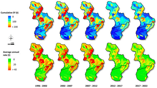 Spatial distribution of the cumulative (CSY) and average (ASY) sediment yields, estimated using GeoWEPP for retroactive five-year periods in the middle and upper sub-catchments of the Azohía Rambla.