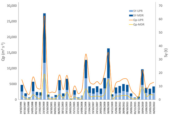 Peak discharges and potential average sediment outputs estimated with GeoWEPP for the flow events that occurred during the period 1996–2022.