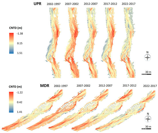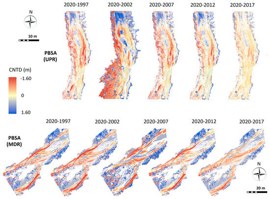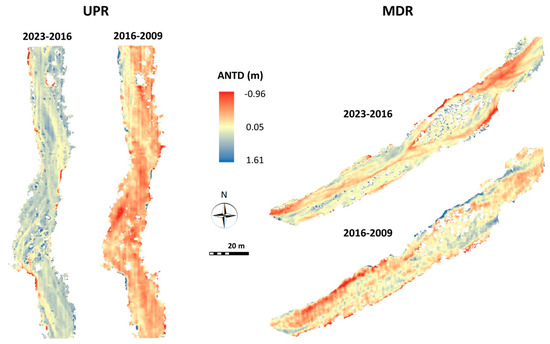 DoDs resulting from the difference between the DEMs derived from the NPAO 2009 and 2016 LiDAR point clouds (0.5 m per pixel) and those generated with SfM-MVS in 2018 and 2023 after being converted to the same resolution. Upper and Middle RCRs.
