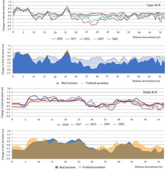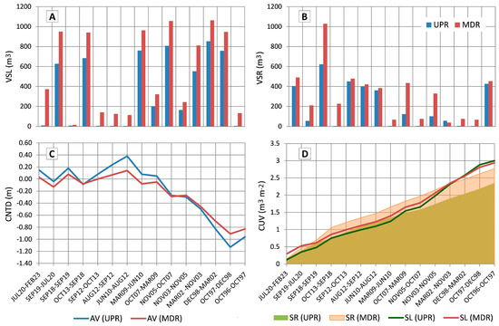 Changes in the bed elevation, areas and volumes of erosion and deposition, and sediment budgets (net, unit, and total values) were calculated for both RCRs (UPR and MDR) and their respective PBSAs by combining the HRDoDs derived from each pair of consecutive HRMDT and high-density 3DPC. In particular, the total net volume difference (TNVD) (m3), average net thickness difference (ANTD) (m) for the monitored area, percent imbalance (PI) (%) (departure from equilibrium), total area of surface lowering (TASL) (m2), total area of surface raising (TASR) (m2), average unit volume of surface lowering (UVSL) (m3 m−2), and average unit volume of surface raising (UVSR) (m3 m−2) were calculated by applying different algebraic algorithms and matrices to the raster elevation images of interest, or simply to the HRDoD in question. The errors associated with these estimates were described and assumed for each comparative survey analysis according to Brasington et al. [33], providing very good accuracy in the assessment of pre- and post-flood-event sediment budgets.