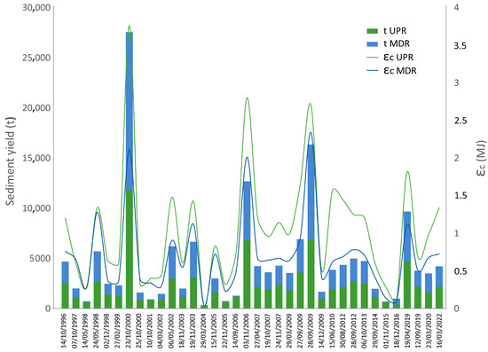 The SY values show similar patterns at the event level in both UPR and MDR. The greatest differences between the two sections occur during Class 1 events, during large flash floods, in which the MDR is exposed to potential inputs of 9000 to 27,000 t of sediments, compared with 4700–11,800 t generated by erosion in the sub-watersheds draining to the UPR. This represents an increase of 90 to 137% in the amount of potentially transportable sediments along the MDR with respect to the UPR. This increase is reduced as the category of events decreases between 80 and 115% for EC2 and below 80% for EC3 and EC4. It should be noted that, although most of the sediments are transported in suspension after superficial soil washing processes in the sub-watershed areas, one of the major morphodynamic drivers in this type of gravel-bed stream is, instead, bedload transport [47]. For both RCRs, the relationships between bedload transport and water discharge are dominated by large particles and sudden changes in excess energy during isolated peak discharges. This behavior is consistent with the results found by numerous authors [4,5,48], who classified the bankfull or sub-bankfull discharge as an effective discharge, in our case characterized by a recurrence interval of one to two years.