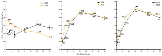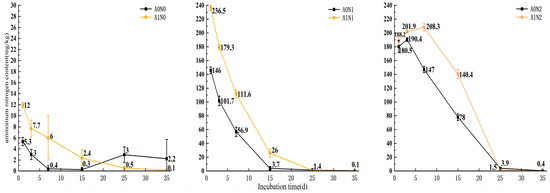 As seen in Figure 1, the ammonium nitrogen content of the N1 application peaked on the first day of incubation and then decreased rapidly. At the same time, the ammonium nitrogen content of the N2 application showed a trend of increasing and then decreasing. The soil ammonium nitrogen content of all the nitrogen fertilizer treatments decreased to the lowest from 25 to 35 d with no difference from the control treatment. Under the condition of no microbial fertilizer application, the ammonium nitrogen content of A0N1 treatment peaked on the first day of incubation, and A0N2 peaked on the third day of incubation. The ammonium nitrogen content of all nitrogen treatments in saline soil was significantly higher than the A0N0 treatment. Under the conditions of microbial fertilizer application, the ammonium nitrogen content of A1N1 reached its peak on the first day of incubation, A1N2 reached its peak on the seventh day of incubation, and the ammonium nitrogen content of all the nitrogen fertilizer treatments was significantly higher than that of A1N0. On d 1, the trend in soil ammonium nitrogen content was A1N1 > A1N2 > A1N0, and on d 3–15, the trend in soil ammonium nitrogen content was A1N2 > A1N1 > A1N0. On balance, the A1 treatment had a higher ammonium nitrogen content than the A0 treatment from d 1–25 with the same amount of nitrogen fertilizer. By d 15 of incubation, the nitrogen contents of A0N1 and A1N1 were 97.5% and 89.0% lower than their respective maximum ammonium nitrogen content, and the nitrogen contents of A0N2 and A1N2 were 62.4% and 32.6% lower than their respective maximum ammonium nitrogen content, with the N1 treatment dropping to the lowest ammonium nitrogen content and the N2 treatment maintaining a higher content. Comparing the maximum ammonium nitrogen content of the applied nitrogen treatments, A1N1 had the maximum ammonium nitrogen content of 236.50 mg/kg, which was 62.0%, 14.0%, and 13.6% higher than A0N1, A0N2, and A1N2, respectively, and A1N2 increased by 9.4% compared to A0N2.