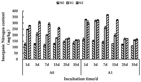 From Figure 3, the inorganic N content of the soil under the N1 fertilizer dosage first declined and then remained nearly unchanged, while the inorganic N content of the soil under the N2 fertilizer dosage first increased, then decreased, and then remained nearly unchanged. The trend in inorganic nitrogen content was A1N1 > A0N1, A1N2 > A0N2, A0N2 > A0N1 from 1 to 15 d of incubation, and the difference in inorganic nitrogen content was smaller between the nitrogen fertilization treatments from 25 to 35 d of incubation.