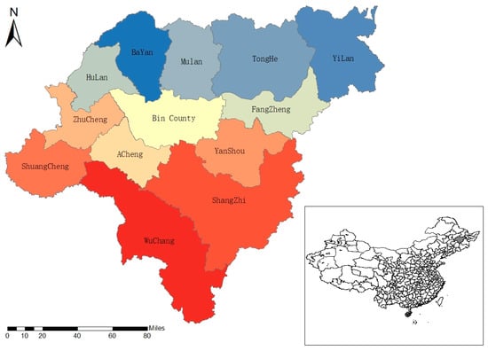 Harbin, located between 125°42′ and 130°10′ E longitude and 44°04′ and 46°40′ N latitude, is one of the central cities in Northeastern China and the city with the third-largest household population and the largest land area under jurisdiction among Chinese provincial cities. In terms of administrative subdivisions, Harbin (Figure 1) includes four districts, namely the main urban area, Acheng District, Hulan District, Shuangcheng District, as well as nine counties, namely Wuchang City, Shangzhi City, Bin County, Founder County, Yanshou County, Bayan County, Mulan County, Tonghe County, and Yilan County, of which the main urban area includes six districts, namely, =Nangang District, Daoli District, Dawai District, Xiangfang District, Songbei District, and Pingfang District.
