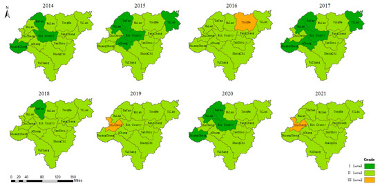 In terms of the sustainable use level, it can be seen from Figure 2 that the spatial distribution pattern for the degree of sustainable use of water resources in Harbin City from 2014 to 2021 is relatively stable in the six districts (counties) of Tonghe County, Founder County, Mulan County, Yanshou County, Shangzhi City, and Wuchang City and shows changes in the seven districts (counties) of Bin County, Shuangcheng District, Bayan County, Acheng District, Yilan County, Hulan District, and the main city. The degree of sustainable use of water resources in all districts (counties) of Harbin City is mostly level II for the eight years studied.