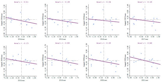 Based on the global correlation test, the results in Figure 3 show that the Moran indexes of the degree of sustainable water resource utilization in Harbin City for 2014–2021 are −0.211, −0.159, −0.104, −0.128, −0.175, −0.200, −0.188, and −0.248, respectively. This study indicates that the spatial distribution for the degree of sustainable water resource utilization in the 13 districts (counties) of Harbin City showed a negative correlation for 2014–2021.The blue circle in the figure refers to the 13 districts (counties) of Harbin City.