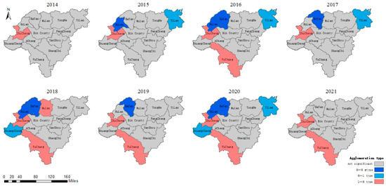 In the local correlation test, all of the results from 2014 to 2021 passed the significance test at the 95% confidence level, indicating that the degree of sustainable water resource use showed the aggregation of phase differences in some districts (counties). The results of their local spatial autocorrelation are shown in Figure 4. From the local spatial autocorrelation analysis, we can see that the “L-H” agglomeration of sustainable water resources utilization in Harbin City from 2014 to 2021 is mainly distributed in the main urban area and Wuchang City; the “H-H” agglomeration is mainly distributed in Hulan District and Bayan County; the “H-L” agglomeration is mainly distributed in Shuangcheng District and Yilan County; and there is no “L-L” agglomeration type.