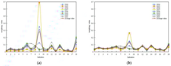 Changes in weight values of different indicators from 2014 to 2021: (a) Coefficient of variation method weight value, (b) Subject–objective combination weight value.