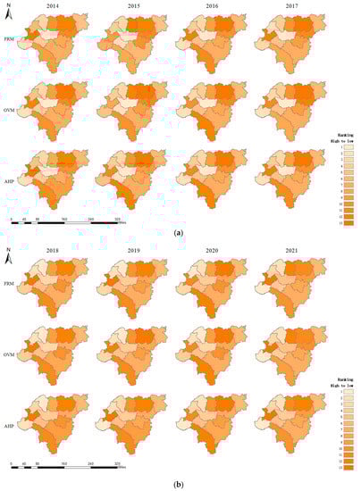 The methods of determining weights can be divided into two categories: the subjective weighting method and objective weighting method. The subjective weighting method mainly includes the Delphi method, sequential relationship analysis (G1), and the hierarchical analysis method (AHP), which determine the weights of each index based on experts’ experience in scoring and ranking and are more subjective. The objective weighting method mainly includes the entropy weighting method (EVM) and coefficient of variation method (CVM), which determine the weights of indexes based on objective data and indexes and are more objective. Since sustainable water resource utilization is a complex system influenced by several factors, the G1 method was used in combination with the coefficient of variation method in this study to improve the scientific accuracy of the results. Compared with the commonly used subjective ascertainment method of hierarchical analysis (AHP), the G1 method has a clear process and simple operation and solves the shortcomings of the AHP method, which requires consistency testing, having better practicality. As can be seen from the comparison, the weights of the same indicator obtained by using the “G1-CVM” combination of weights have been more consistent over the years, indicating that the improved method is reasonable for determining the weights of the indicators. Since G1 determination has previously been applied in water security evaluation and has not been used for water resources, the close value method and the AHP method were used for comparison in order to verify its applicability. Because different evaluation models are not necessarily comparable in terms of values, while the evaluation models themselves are comparable, the values reflecting water resources’ sustainable use level were ranked from the highest to the lowest row. The results of the comparison of the three methods for the same year show that the consistency of the three methods, in terms of ranking order, is very high. Due to the different theories of these methods, some districts (counties) have deviations, but basically, they all differ by one ranking, and the relative variability is very low, which indicates that the methods are feasible.
