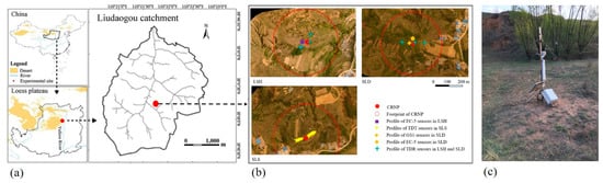 In LSH and SLD plots, one cosmic ray neutron probe (CRNP) (Probe Science and Technology Ltd., Beijing, China) and three profiles of time domain reflectometry (TDR) sensors (TDR310S, Acclima, Inc. Meridian, ID, USA) buried at different depths and covered by different vegetation were established, respectively (Figure 1). In the SLS plot, one CRNP and nine profiles of time domain transmissometry (TDT) sensors (Acclima, Inc. Meridian, ID, USA) buried at different depths and covered by different vegetation were established. CRNPs, TDR sensors, and TDT sensors are used to measure temporal SWCs on two scales and different depths of the three plots. The distribution of sensors and plant species in the plots are listed in Table 2. All of the SWC sensors were calibrated through the oven-dried method, which obtained the SWC samples from profiles near the sensors and depths in the same manner.