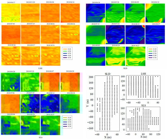 Temporal variations in the SWC spatial distributions and the sampling point distributions in each of the three plots.