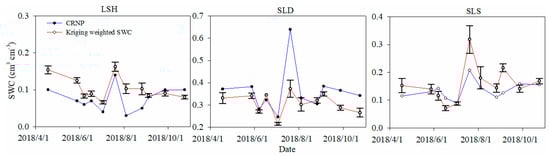 Daily average SWCs estimated from the CRNPs and 0–30 cm Kriging-weighted average SWCs in three plots on 17 April, 28 May, 6 and 16 June, 3 and 19 July, 4 and 26 August, 4 and 26 September, and 24 October 2018. The error bars are standard deviations.