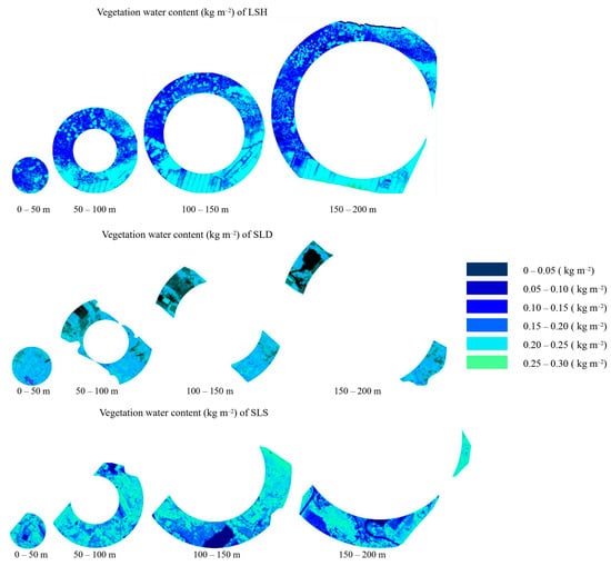 The distributions of biomass and vegetation water of four radii measured on 30 June 2018 are shown in Figure 4 and Figure 5. The total dry above-ground biomass and vegetation water quantity in each of the three plots are presented in Table 5. Additionally, the changes in measured and simulated total dry AGB (kg) and vegetation water per m2 (kg m–2) of the three plots are shown in Figure 6.
