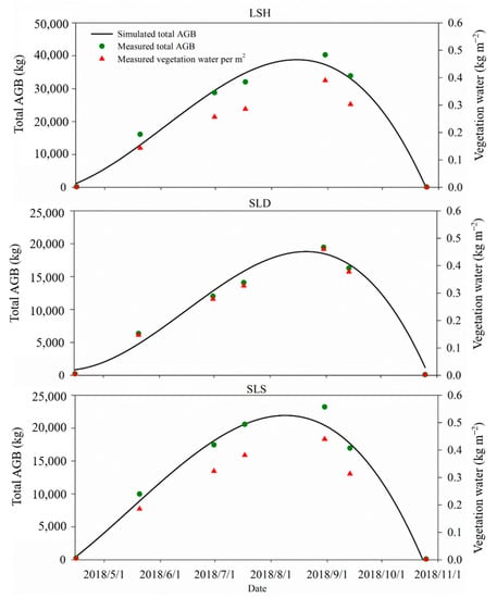 The changes in the measured and simulated total dry AGB (kg) and vegetation water per m2 (kg m–2) of the three plots.