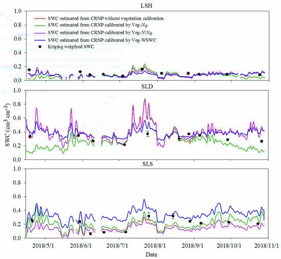 The CRNP SWCs of the three plots were calibrated, and Figure 7 shows the CRNP SWCs in 2018 corrected by three different methods. The Veg–N0 method yielded similar trends at the LSH and SLD sites, which was lower than CRNP SWC without vegetation calibration when biomass was low and higher than it when biomass was high; however, in SLS, the SWC calibrated via the Veg–N0 method was always lower than the CRNP SWC without vegetation calibration. The SWC calibrated via the Veg–N/N0 method was very close to the CRNP SWC without vegetation calibration among the three plots. The SWC calibrated via the Veg–WSWC method performed differently in SLS, estimating the highest SWC in SLS. At the LSH site, the CRNP SWC and SWCs calibrated by the three methods were below 0.2 cm3 cm−3, which is reasonable considering the soil texture in LSH. However, in SLD and SLS, the SWCs during the period of mid-July to August are unreasonably high, likely because during and after precipitation soil is saturated and runoff as well as ponded water on the surface are formed; these water did not infiltrate into soil to form soil moisture but increased the hydrogen density, which was observed by the CRNPs. This being the case, the CRNPs overestimated the SWC. For the SLD site, the SWC values calibrated by the three methods were lower than the SWC values without calibration. Although the calibration methods were performed differently, they exhibited similar patterns for each plot. As Table 6 shows, all three methods reduced the RMSE between the CRNP SWC and the Kriging-weighted SWC, indicating that vegetation calibrations improve the accuracy of the CRNP estimation of the SWC, with the Veg–N0 method having the best estimation. The LSH revealed the lowest RMSE in both conditions with and without calibration, because the biomass at LSH was the lowest value due to a coarser soil texture than the other plots. The soil texture in LSH is loamy sand, with the highest saturated hydraulic conductivity and the lowest organic matter content of the plots, so the SWC is always low, resulting in the low biomass.