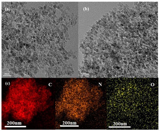 Transmission electron microscopy (TEM) was used to characterize the nano-scale diamond particles. After annealing, the morphology and crystal lattice of the nitrogen-modified diamonds remained similar to those of the untreated diamonds. In Figure 1, the modified N-NDs appear as irregular agglomerates of particles []. Compared with the control samples, the TEM results suggested that the relatively low-temperature annealing and nitrogen doping at 600 °C resulted in no obvious morphological changes []. In the results of the chemical element mapping, a large number of N and O atoms appear, uniformly adhering to the surface of the N-NDs.