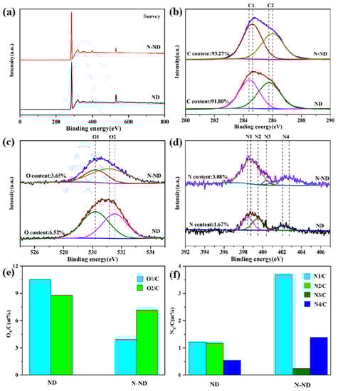 XPS spectra (a) survey, (b) N 1 s, (c) O 1 s and (d) C 1 s. (e) The O/C atomic ratio and (f) N/C atomic ratio.