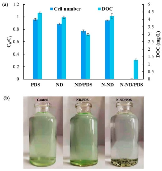 Microcystis removal using different treatments; (a) the removal percentage and DOC results; (b) the suspensions after treatment. The concentration of N-ND was 20 mg/L. The concentration of PDS was 10 mg/L. The treatment time was 120 min. Error bars represent the standard deviations from triplicate experiments.