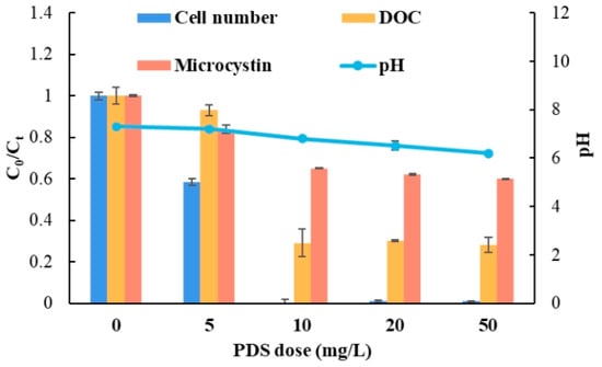 The effect of PDS dosage on Microcystis removal. The concentration of N-ND was 20 mg/L. The treatment time was 120 min. The error bars represent the standard deviations of triplicate experiments.