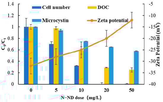 The effect of N-ND dosage on Microcystis removal. The concentration of PDS was 10 mg/L. The treatment time was 120 min. The error bars represent the standard deviations of triplicate experiments.