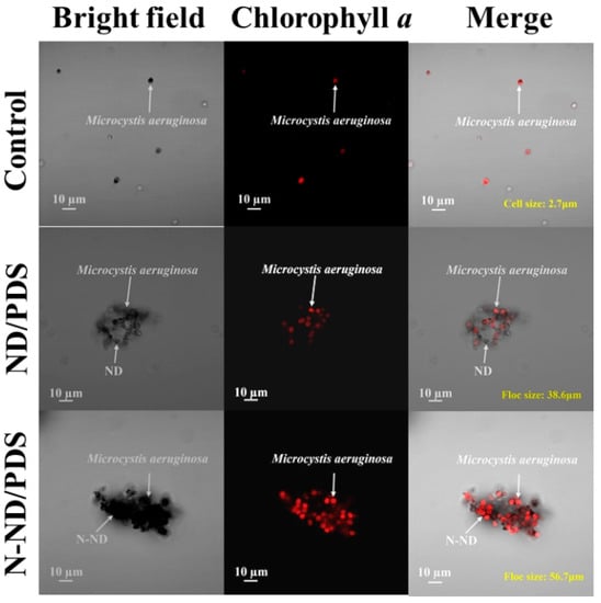 Confocal micrographs of Microcystis floc after ND/PDS and N-ND/PDS treatment. The concentration of N-ND and ND was 20 mg/L in both cases. The dosage of persulfate was 10 mg/L. The initial cell concentration was 2.0 × 106/mL.
