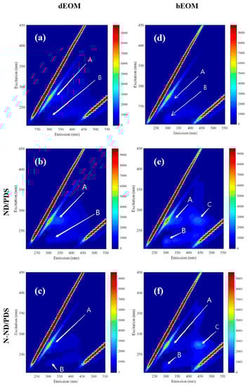 Fluorescence EEM spectra of dEOM after treatment (a) control, (b) ND/PDS treatment and (c) N-ND/PDS treatment and bEOM (d) control, (e) ND/PDS treatment and (f) N-ND/PDS treatment. The concentration of N-ND was 20 mg/L, and the dosage of PDS was 10 mg/L. The initial concentration of cell number was 2.0 × 106 cells/mL. The pre-oxidation and sedimentation times were both 120 min.