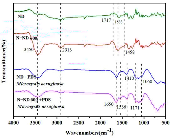 Fourier transform infrared spectra showing the changes in spectral features in ND, N-ND, ND/PDS and N-ND/PDS treatment. The concentration of catalyst was 20 mg/L, and the dosage of persulfate was 10 mg/L. The initial concentration of cells was 2.0 × 106/mL.