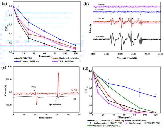(a) Scavenger quenching of Microcystis removal by N-ND with PDS; (b) the spectra with DMPO spin-trapping; (c) chronoamperometry with ND and N-ND electrodes after adding PDS and extracting EPS; (d) Microcystis removal from different waters. The concentration of N-ND was 20 mg/L, and the dosage of persulfate was 10 mg/L. The initial concentration of cells was 2.0 × 106/mL.